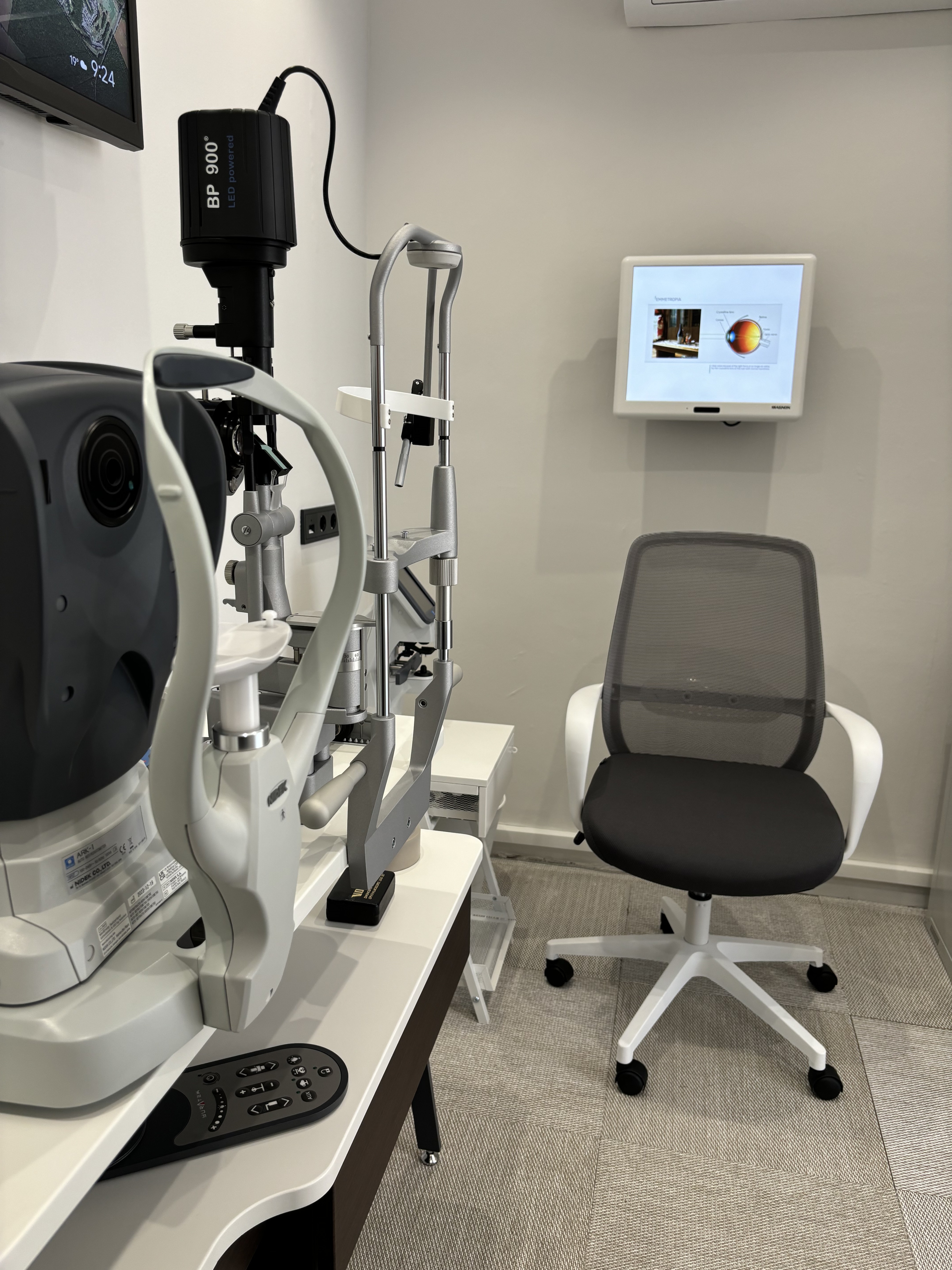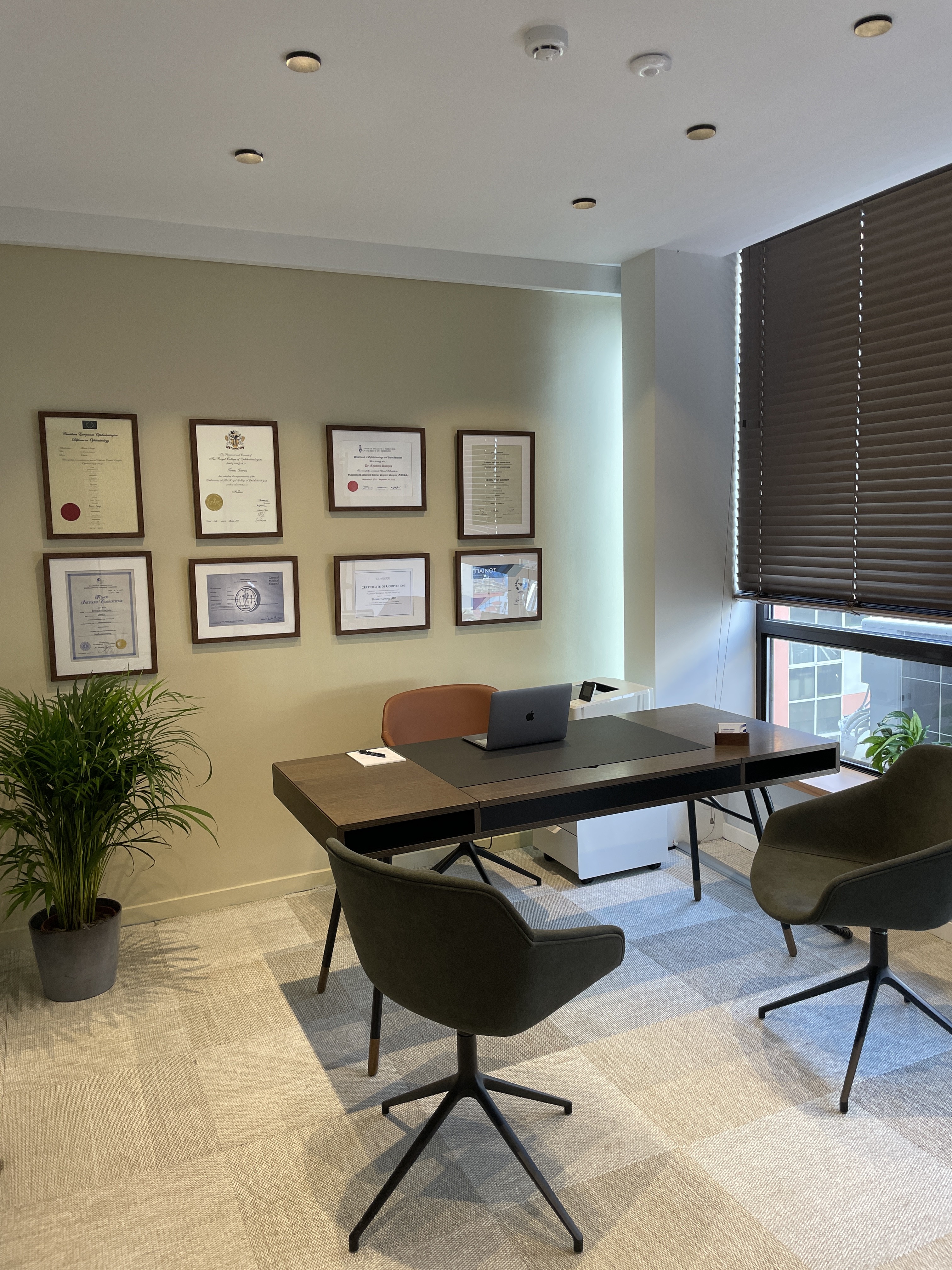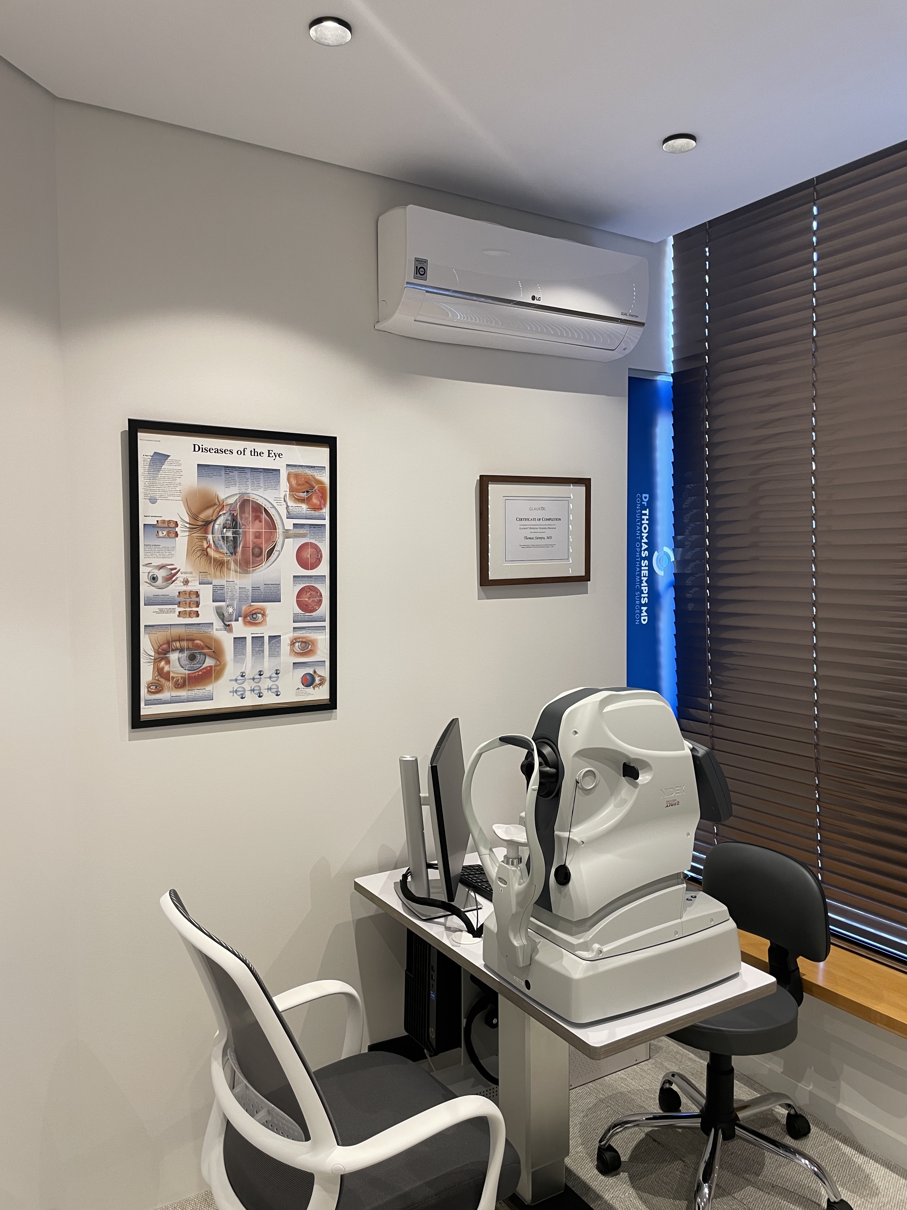 Το ιατρείο είναι σχεδιασμένο με βάση τα οφθαλμολογικά κέντρα του εξωτερικού στα οποία έχει εργαστεί ο ιατρός. Είναι εξοπλισμένο με υπερσύγχρονα και αξιόπιστα μηχανήματα των εταιριών Haag Streit, Nidek, iCare και Heine.