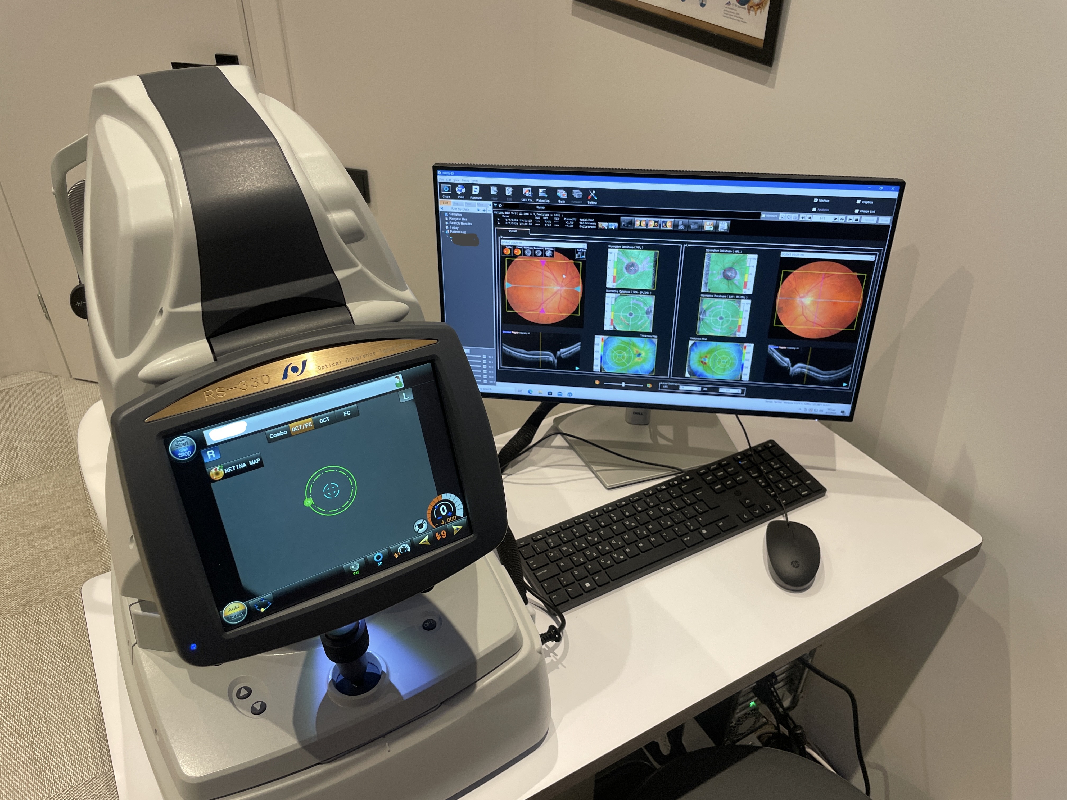 Το ιατρείο είναι επίσης εξοπλισμένο με ηλεκτρονικό διαθλασίμετρο, φακόμετρο και φορόπτερο της εταρίας Nidek αλλά και το τελευταίας τεχνολογιας OCT, OCTA και OCT προσθίων μορίων του ίδιου οίκου (Retina Scan Duo™ 2) παρέχοντας με αυτόν τον τροπο ολοκληρωμένες οφθαλμολογικές διαγνωστικές υπηρεσίες στον ίδιο χώρο.